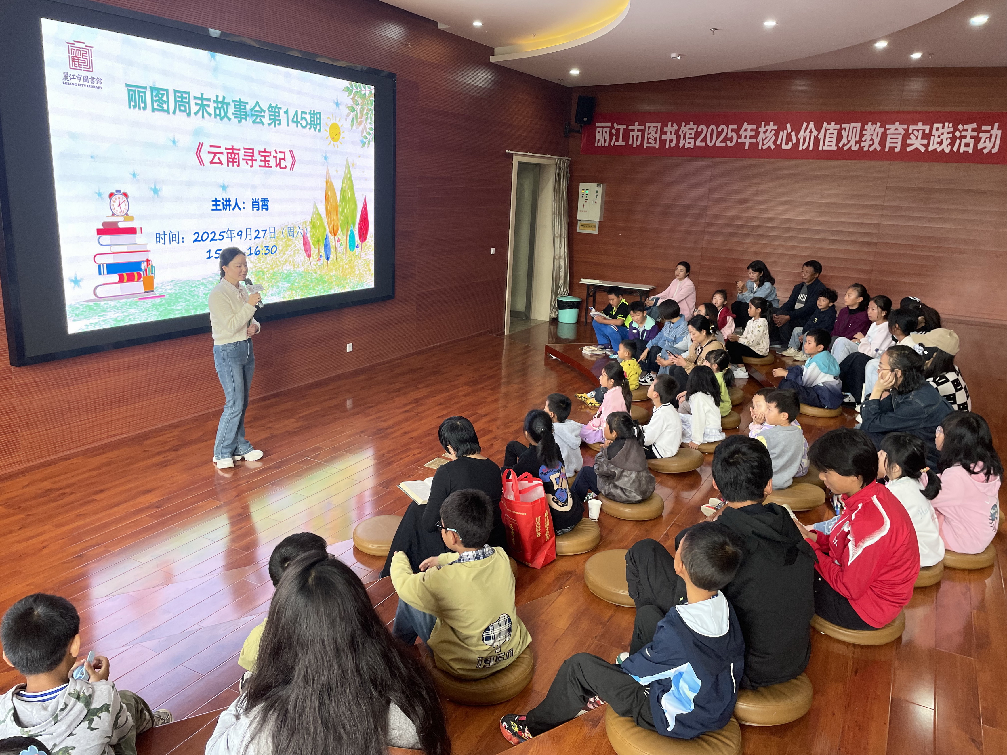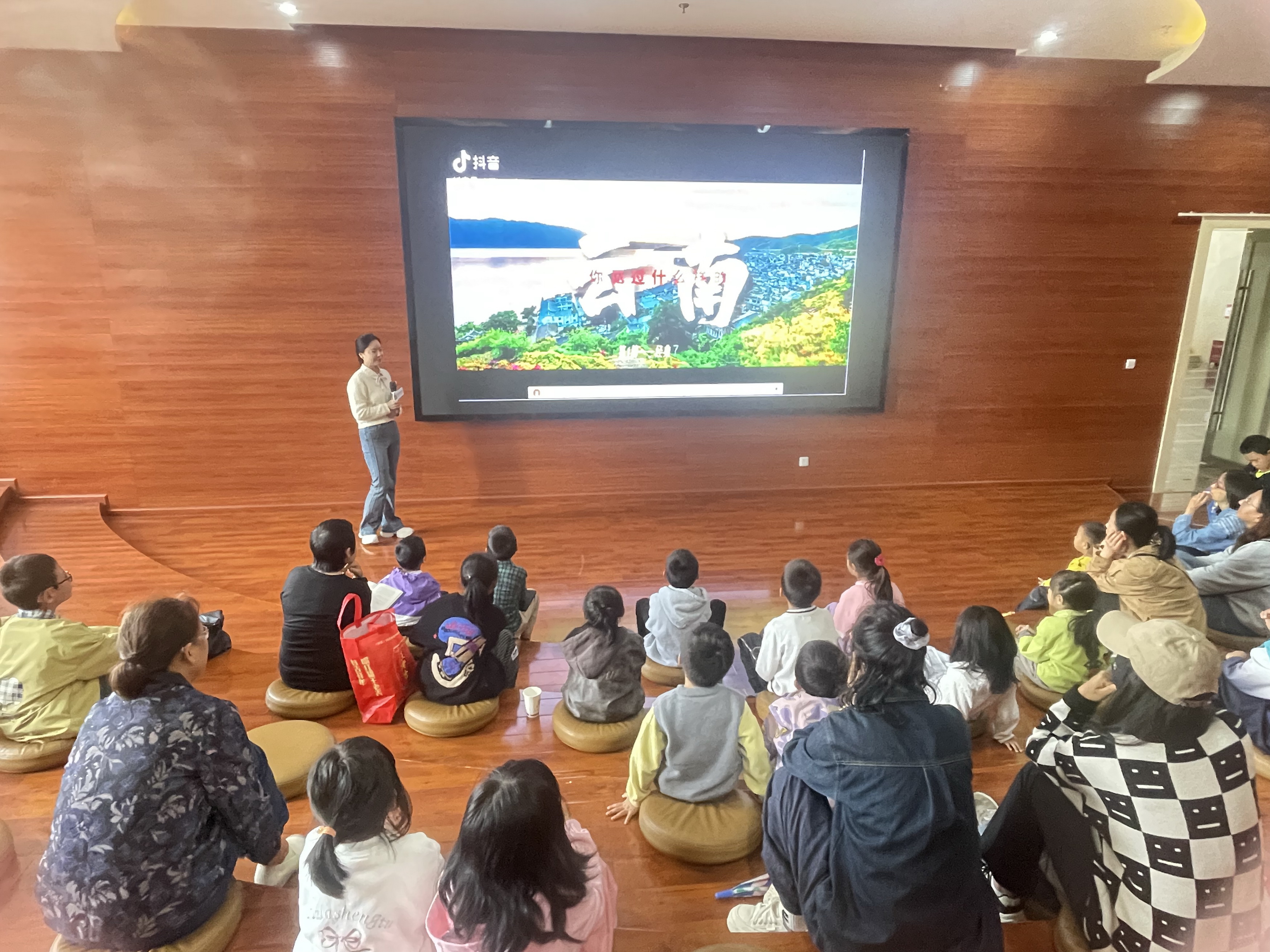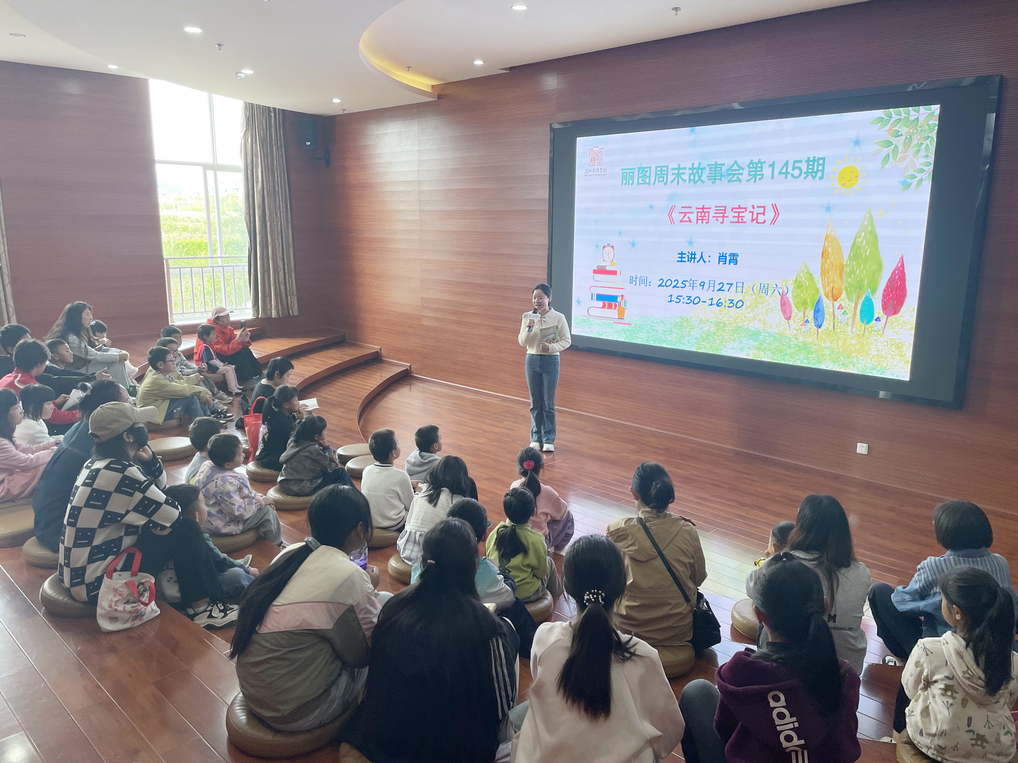 2025月9月27日,丽江市图书馆一楼多媒体阅览室内欢声笑语不断,丽图周末故事会第145期如期举行。本期故事会以《云南寻宝记》为主线,特邀古城区清溪幼儿园园长肖霄老师担任主讲人,通过“丽江—大理—西双版纳”三站文化探索之旅,带领孩子们沉浸式体验云南多彩的风土人情与文化遗产。