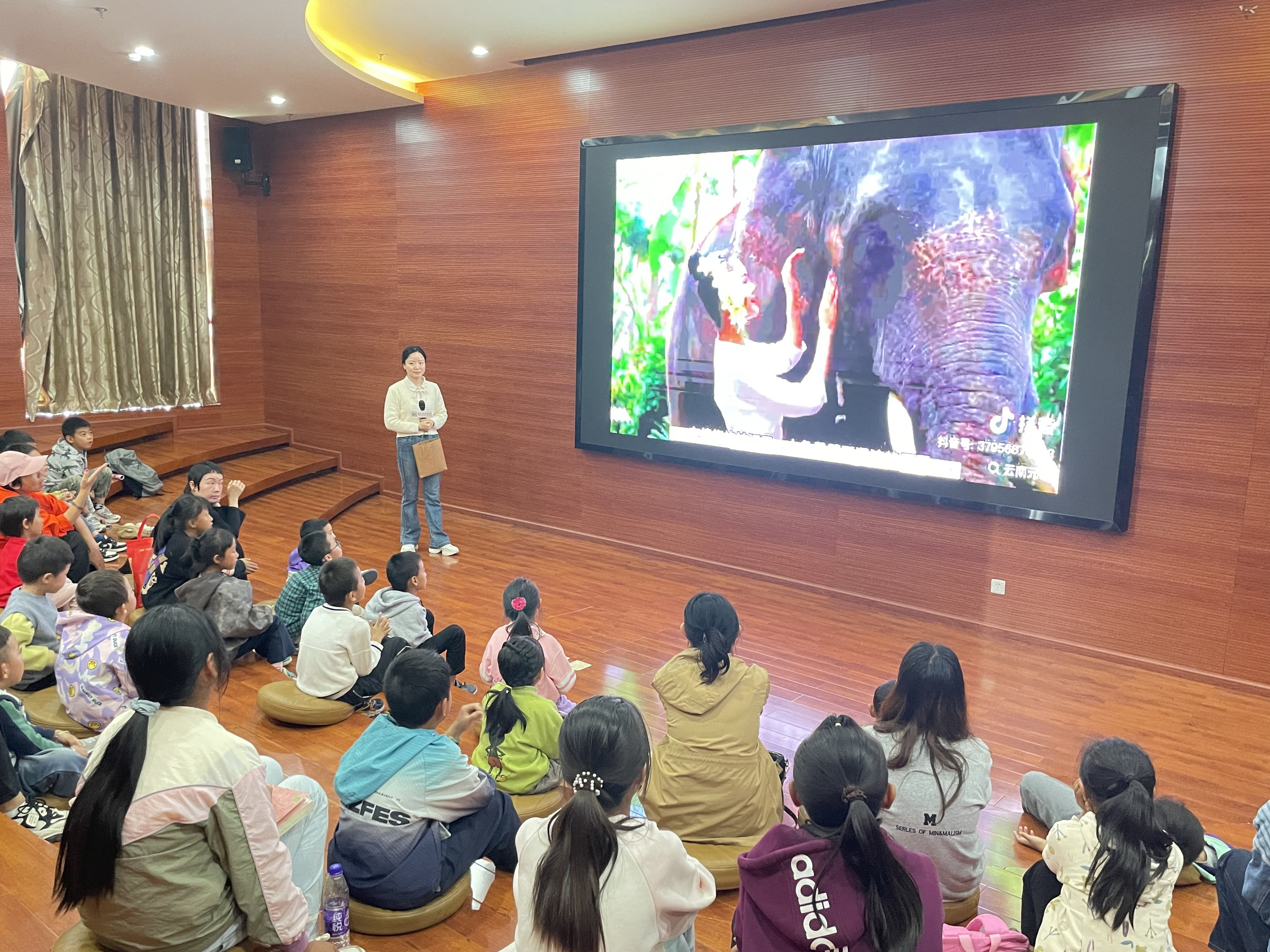 最后一站,肖老师通过播放西双版纳风土人情短片,带领孩子们“穿越”至热带雨林。视频中,傣家竹楼、泼水节盛况、野象谷生态、孔雀飞舞开屏等场景令孩子们惊叹连连。随后的“孔雀舞”教学环节,肖老师化身舞蹈老师,分解孔雀昂首、展翅、抖羽等经典动作,孩子们跟随音乐舒展身姿,模仿孔雀的灵动与优雅。肖老师总结道:“孔雀不仅是美丽的象征,更代表了傣族人民对和谐自然的敬畏。”