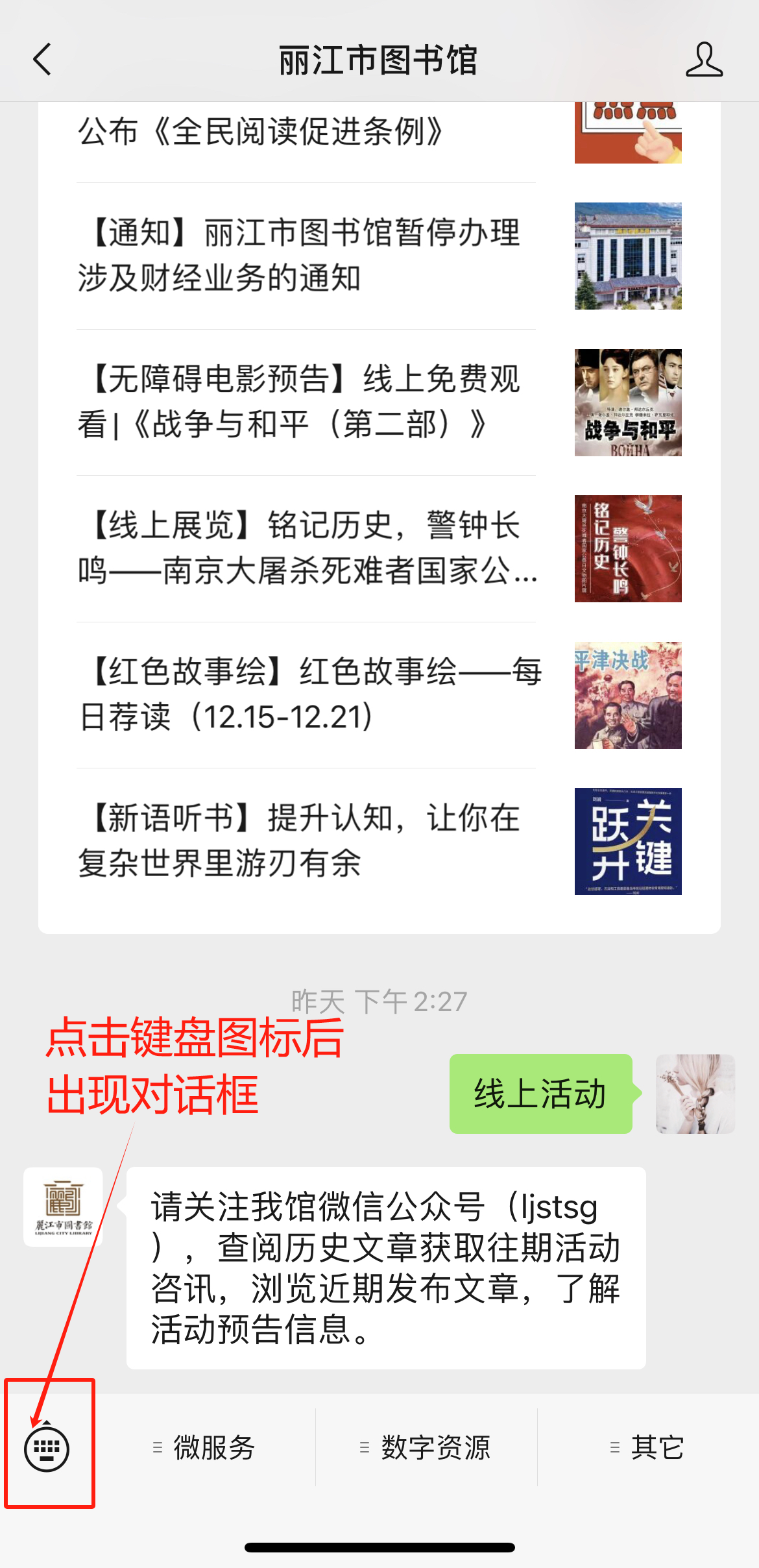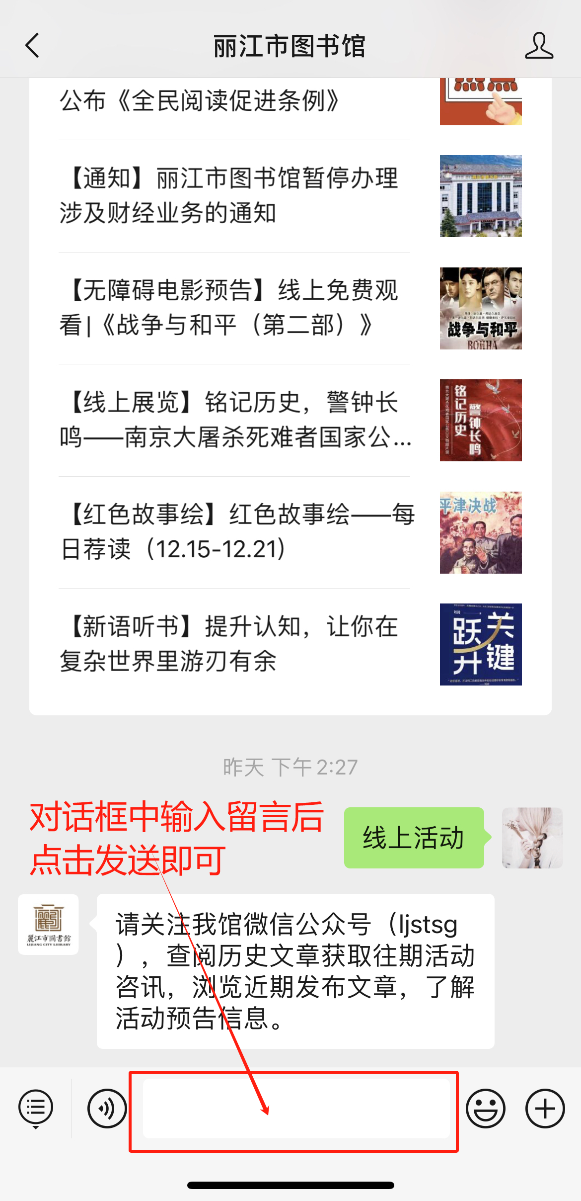 即日起至12月29日00:00,我们面向全社会发起留言征集活动!只需关注“丽江市图书馆微信公众号”,在后台留言,写下您对丽江市少年儿童图书馆的祝福、建议或阅读故事,即有机会获赠精美礼品(共20个获奖名额)。留言要求内容积极、富有创意,字数不限。获奖名单将于活动结束后通过丽江市图书馆微信公众号公布,敬请持续关注!