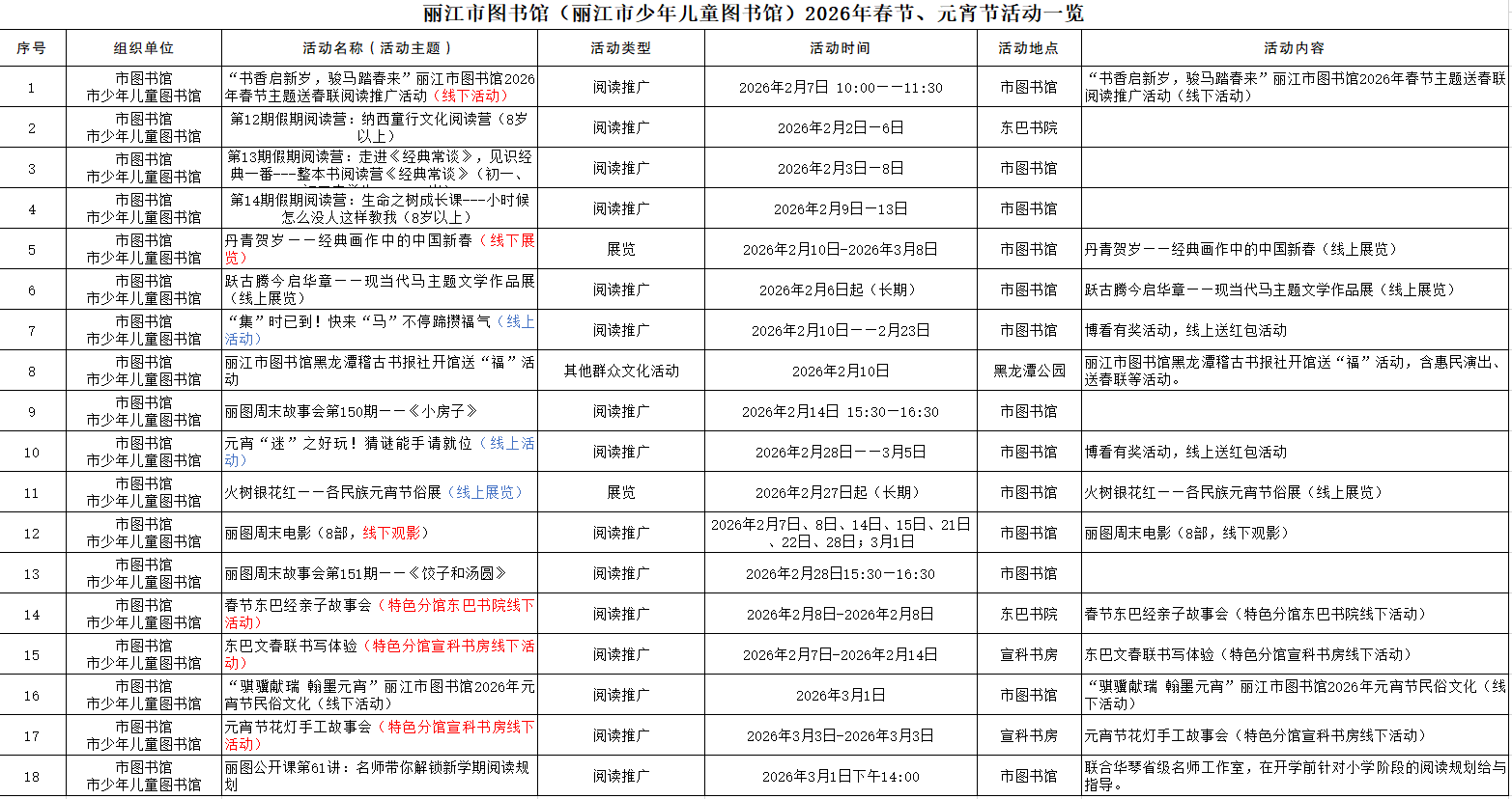 上一篇:« 【活动预告】“书香启新岁,骏马踏春来”丽江市图书馆2026年春节主题送春联阅读推广活动