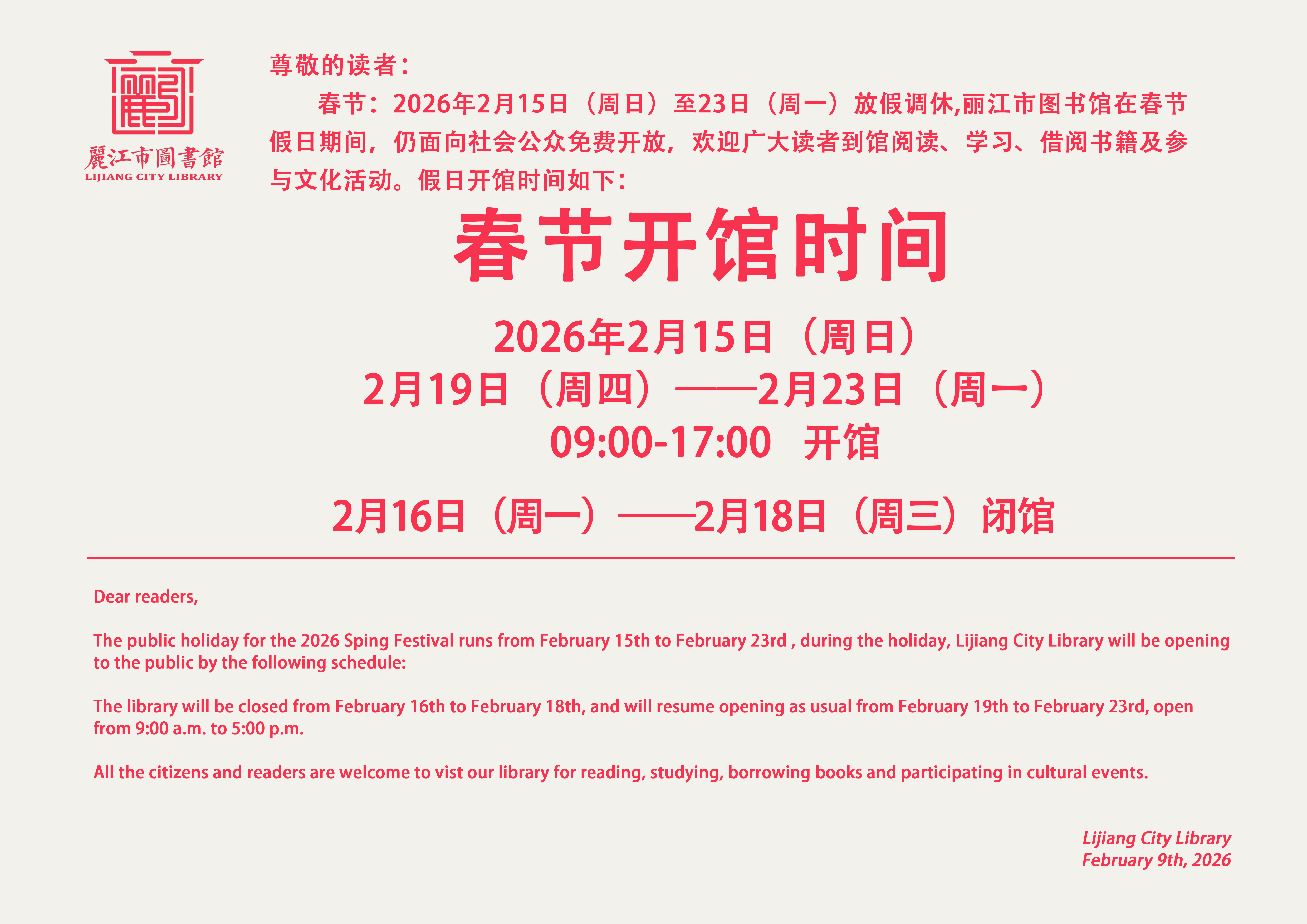 根据《国务院办公厅关于2026年部分节假日安排的通知》精神,春节放假时间为2026年2月15日(周日)至23日(周一),丽江市图书馆仍面向社会公众免费开放,欢迎广大读者到我馆阅读、学习、借阅书籍及参与文化活动。开馆时间如下: