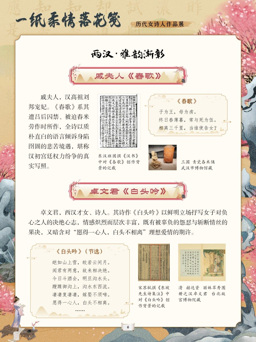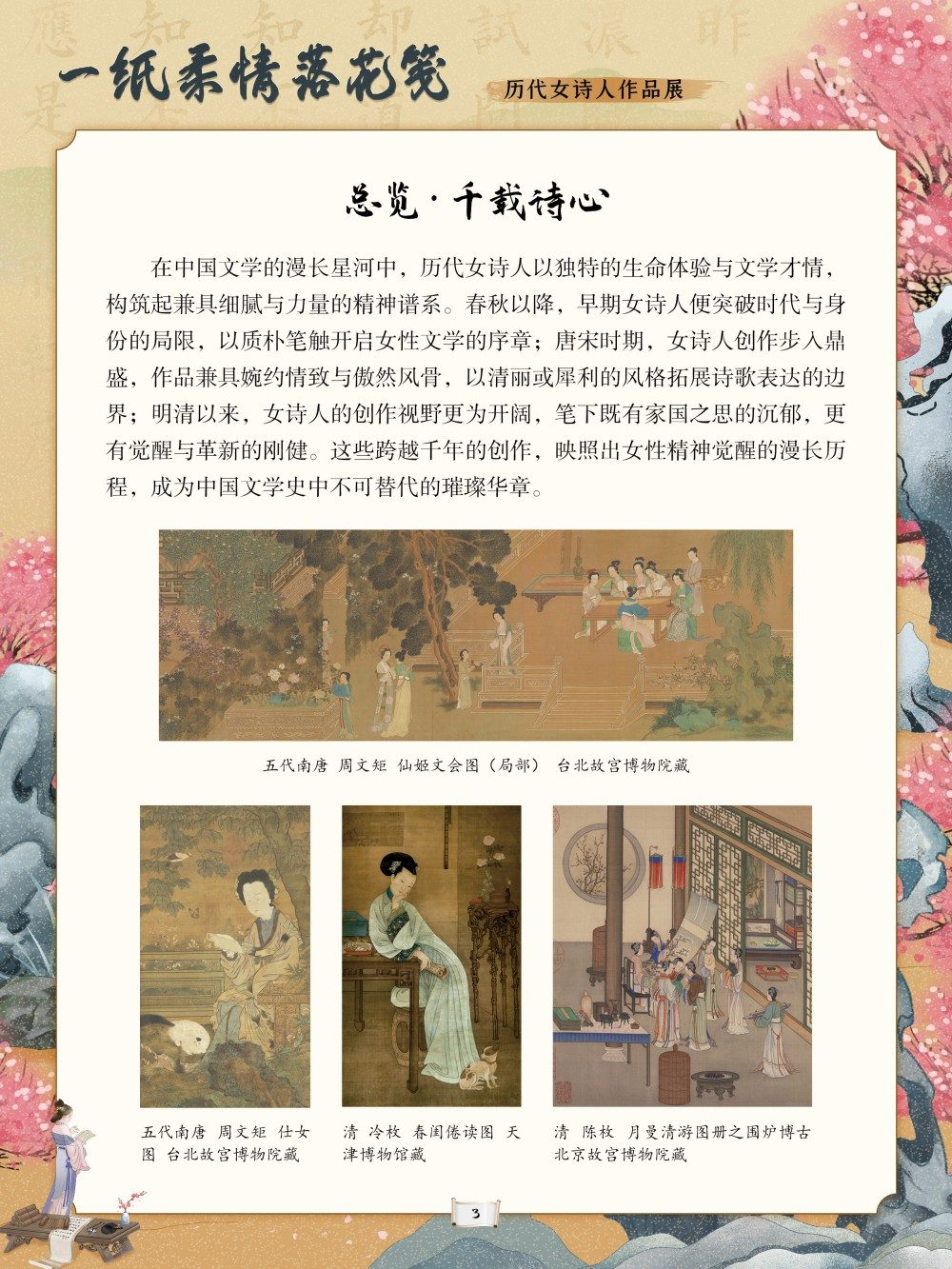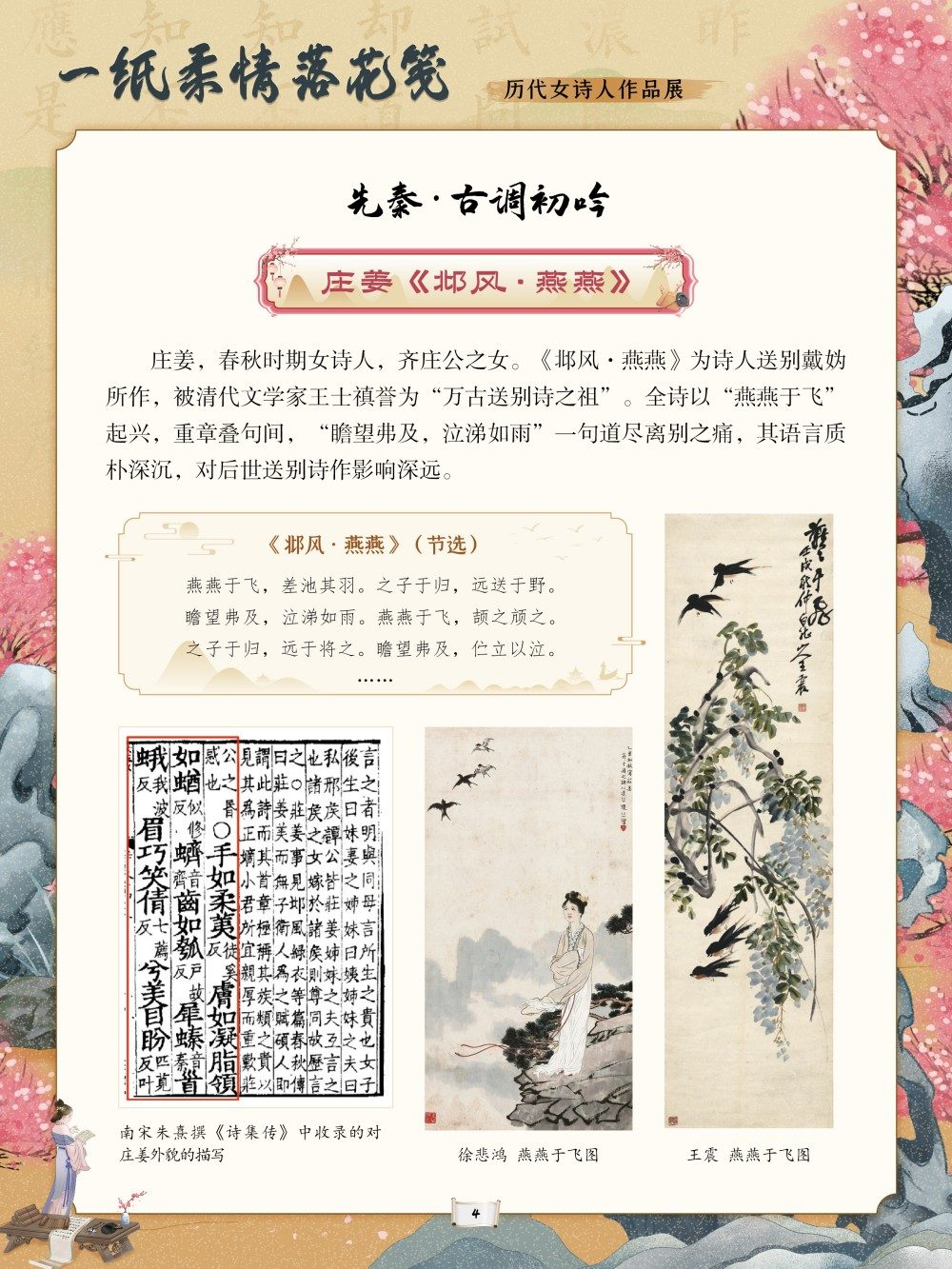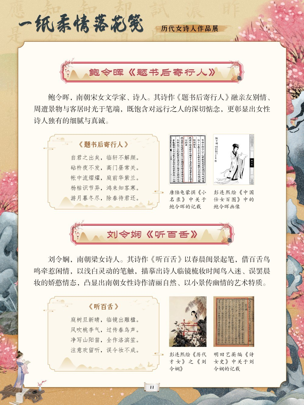 从庄姜“燕燕于飞”的质朴吟唱到薛涛“虚心能自持”的清雅风骨,从李清照“生当作人杰”的铿锵誓言到秋瑾“休言女子非英物”的豪情壮志,每一首诗作都是一段生命轨迹的写照。这些文字或浅吟闺阁闲情,或抒发家国忧思,或呐喊觉醒之志,共同构筑起女性精神世界的璀璨图景。回溯千年诗心,致敬巾帼才情。值此妇女节来临之际,我们特别策划了“一纸柔情落花笺——历代女诗人作品展”,邀您在“燕燕于飞”的古调与“致橡树”的新声中,读懂她们的才情与坚守,感受中华女性文学的深厚底蕴,让这份流淌千年的诗意,成为滋养当下心灵、坚定文化自信的不竭力量。
