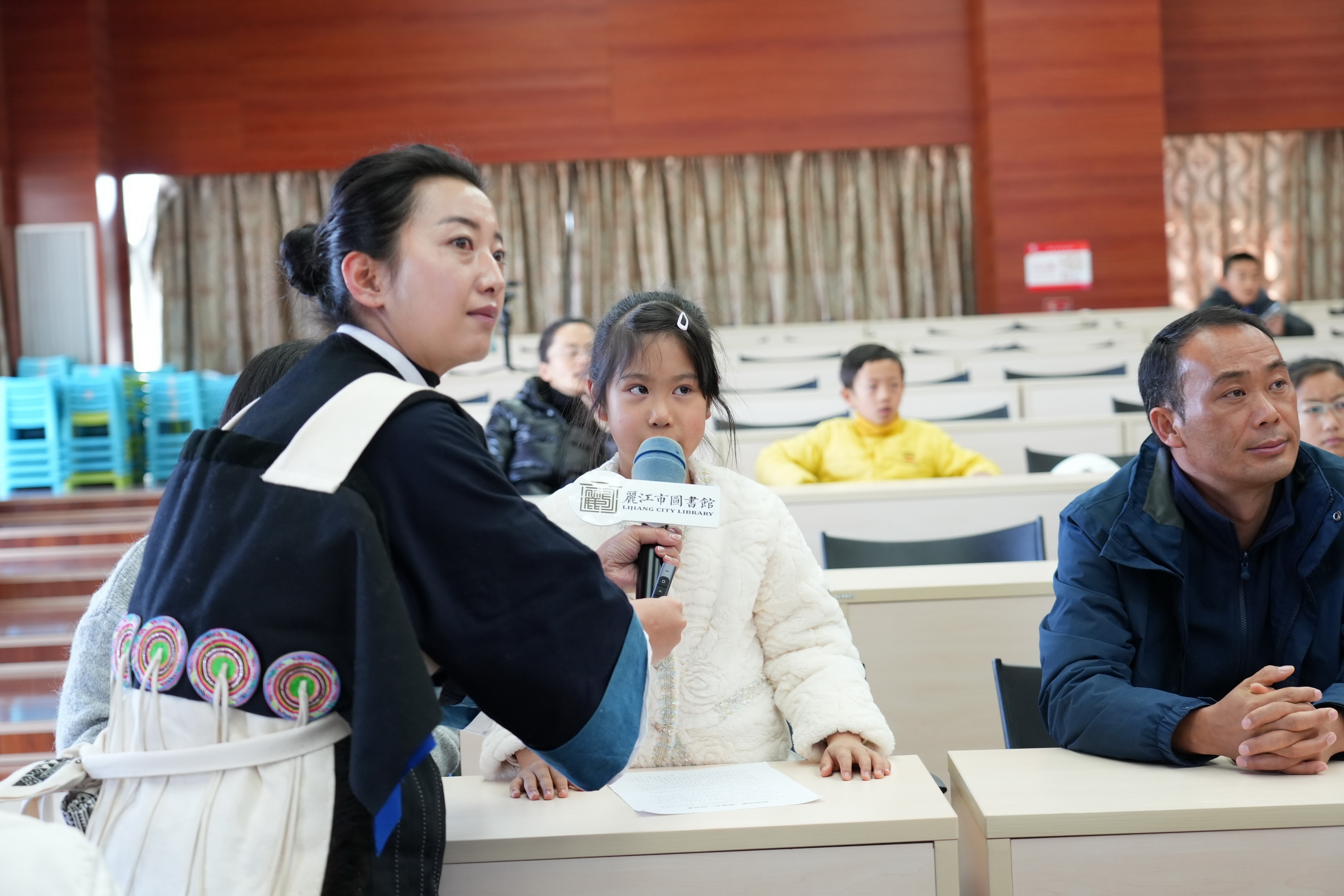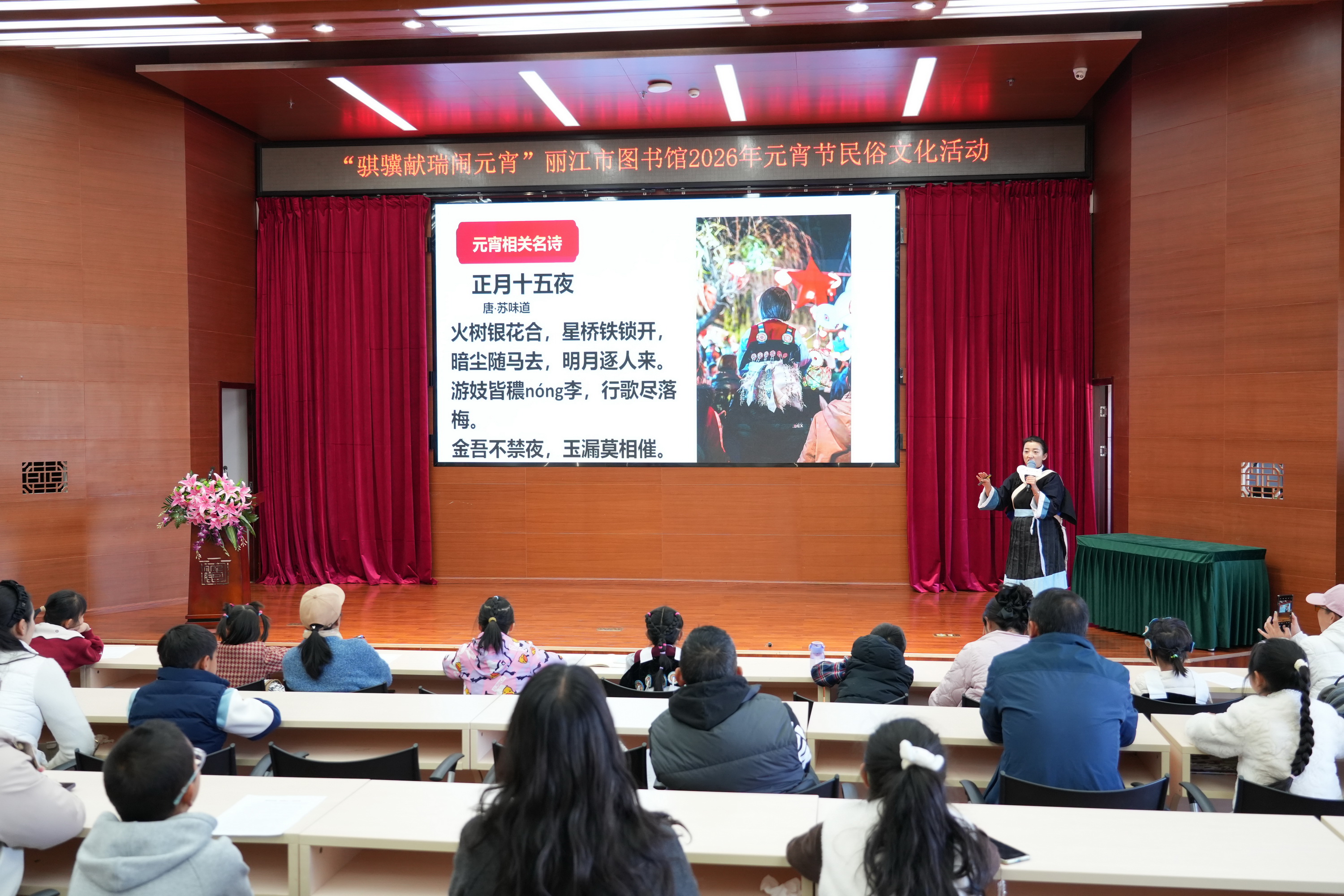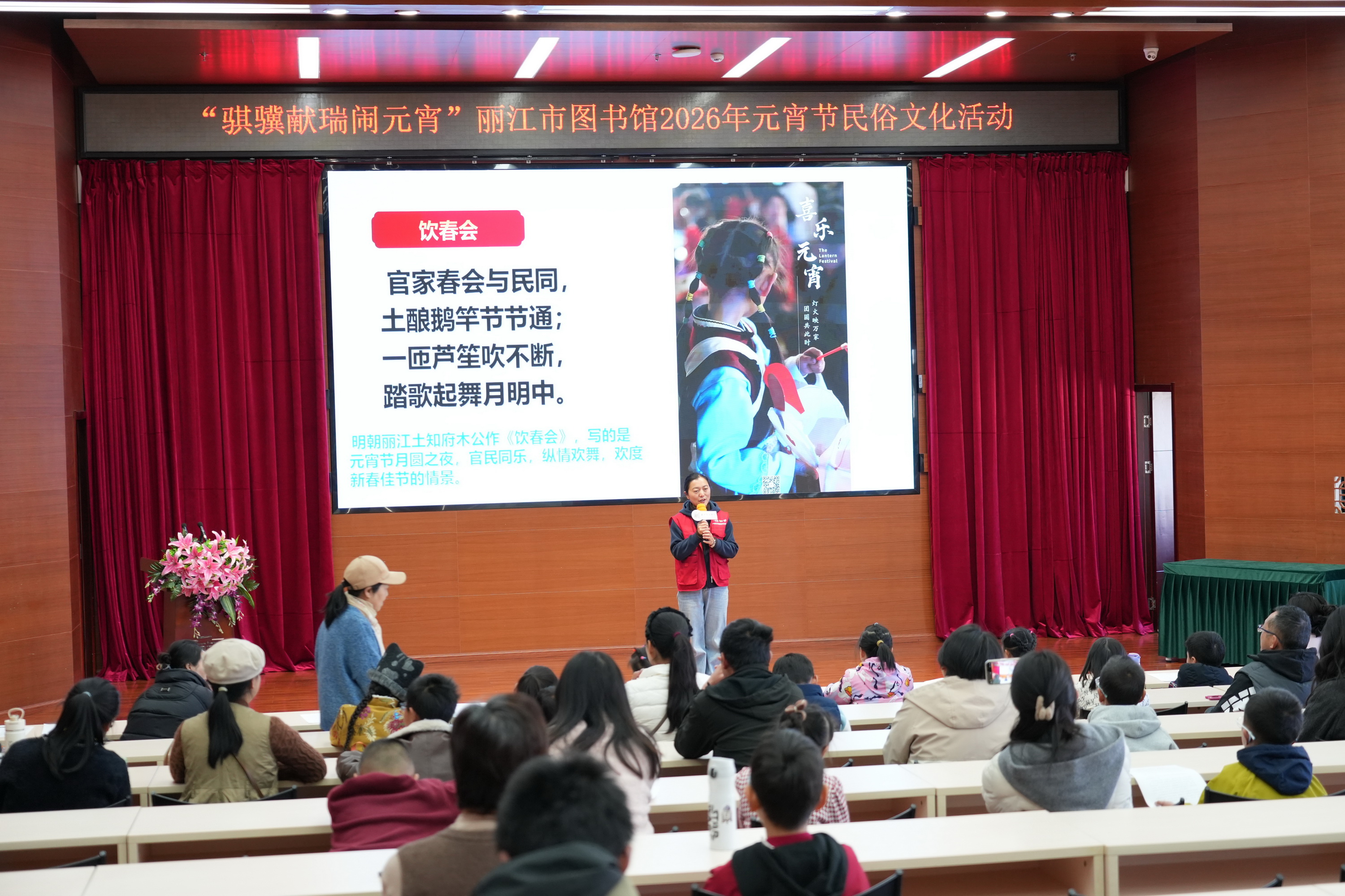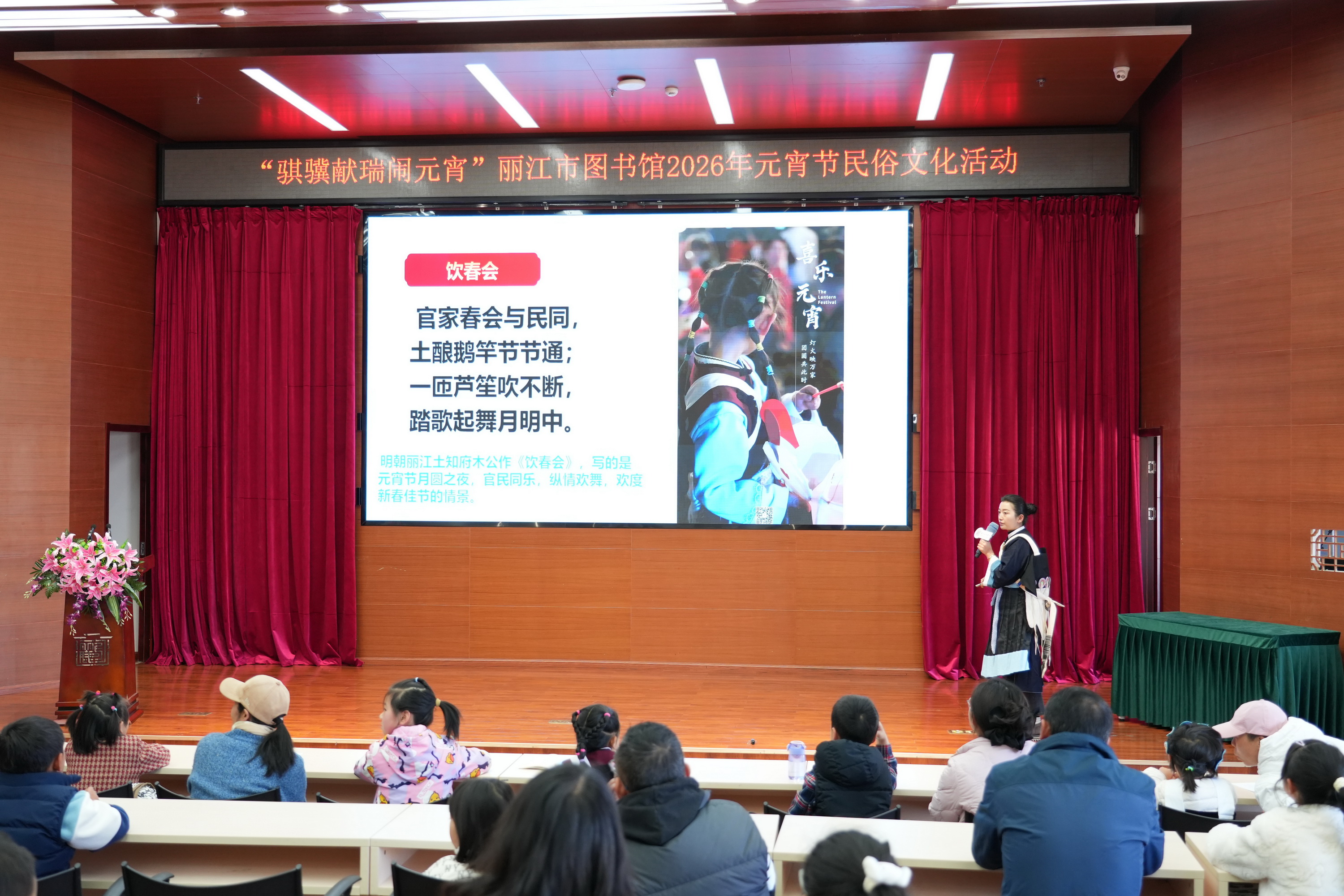 活动首先由丽江市金牌公益阅读点灯人、丽江东巴书院和佳梅老师为读者带来了一场生动的元宵节民俗小讲堂,以图文讲解和问答互动的方式,分享了纳西族在元宵时节的特色民俗活动以及纳西语中有些描述元宵节的词语的由来,将中华传统节日文化与本土民族文化巧妙融合。讲堂上,和老师还通过趣味问答等互动形式,让孩子们在轻松愉悦的氛围中加深了对节日文化的理解,现场掌声与欢笑声此起彼伏。