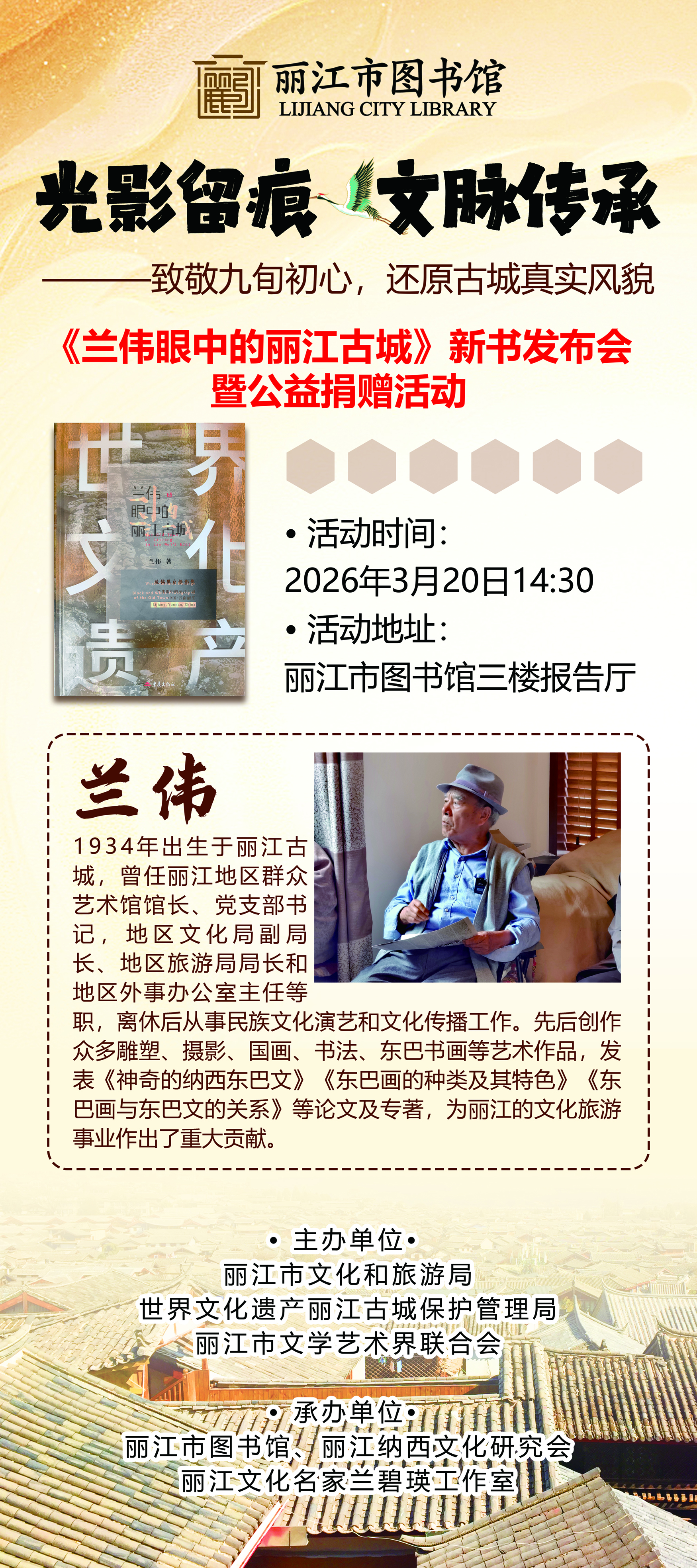 为传承世界文化遗产丽江古城文脉,致敬兰伟老师深耕丽江 古城文化研究、守护世界文化遗产的九旬初心,让承载古城风貌 与人文情怀的珍贵成果走进大众,凝聚文化遗产保护与传承的社 会力量,切实做好地方文化成果传播与推广工作,特举办《兰伟眼中的丽江古城》新书发布会暨公益捐赠活动。