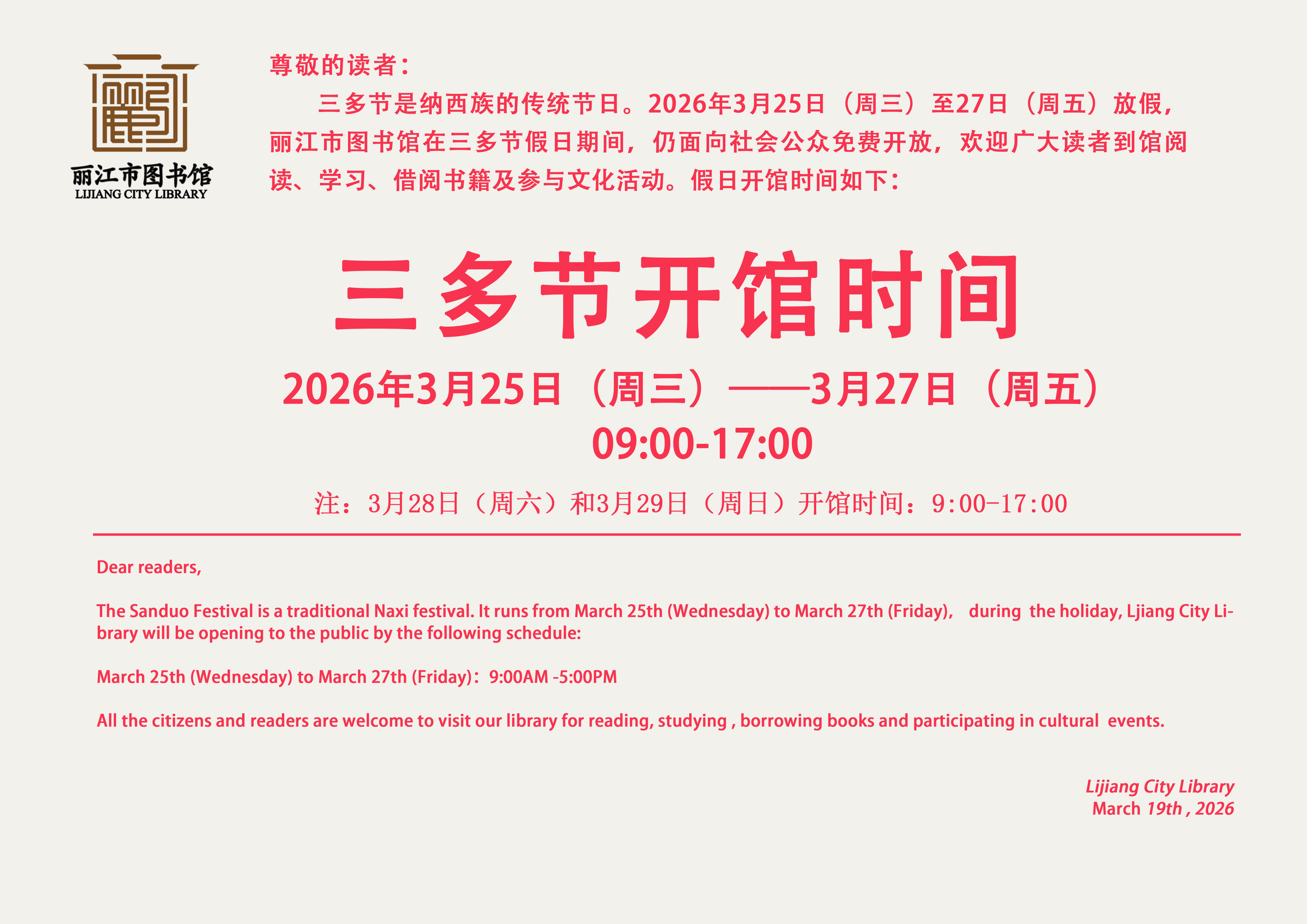 三多节是纳西族的传统节日。三多节期间(2026年3月25日至3月27日),丽江市图书馆仍面向社会公众免费开放,欢迎广大读者到我馆阅读、学习、借阅书籍及参与文化活动。假日开馆时间如下: