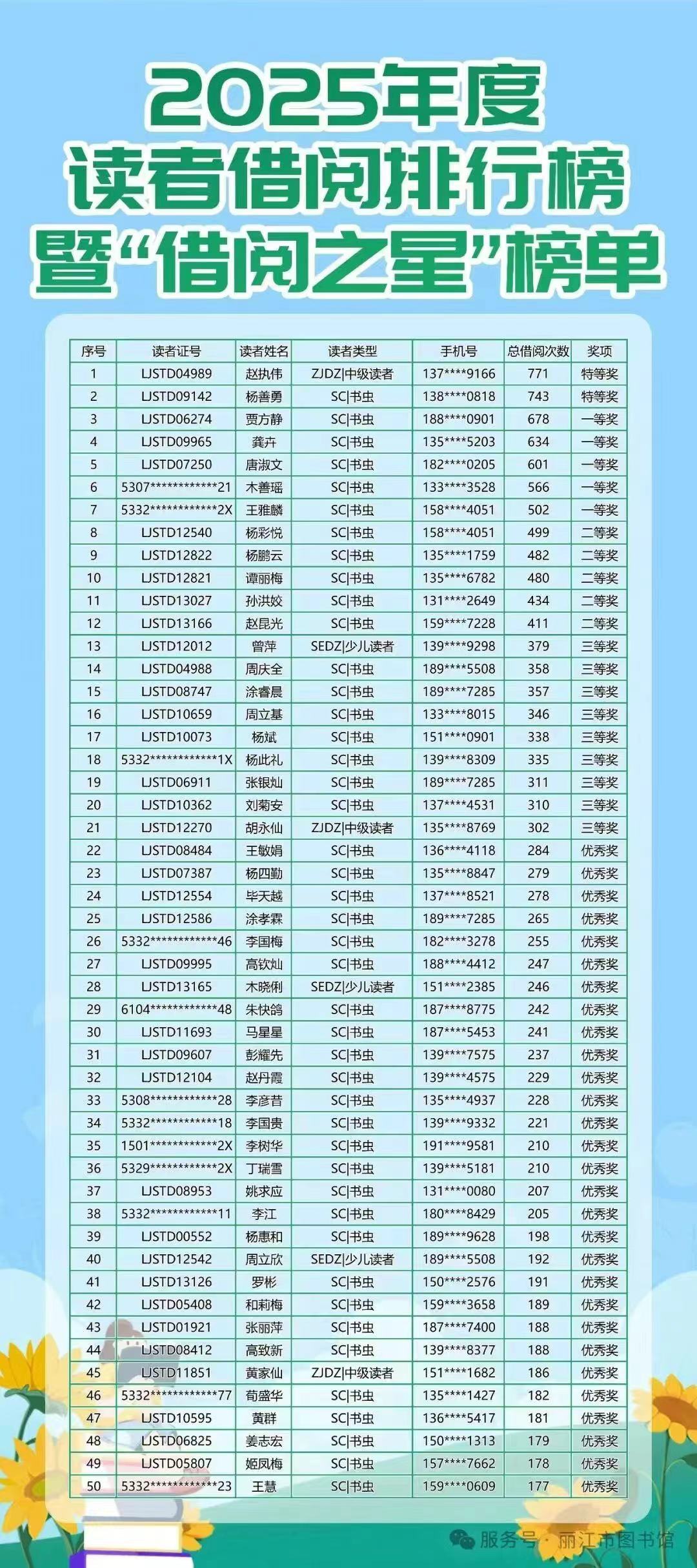 “借阅之星”评选活动自2017年开展首届评选活动以来,已经连续10年开展(已开展了2016年度-2025年度评选)活动,始终秉持公平、公开、公正的原则。本年度评选严格依据读者在2025年1月1日至12月31日期间,于全市任一公共图书馆产生的纸质图书借阅总册次进行统计与排名。经过系统统计与复核,最终从全市范围内评选出借阅量最高的前50名读者授予本年度“借阅之星”,我们谨向所有获奖读者表示祝贺!
