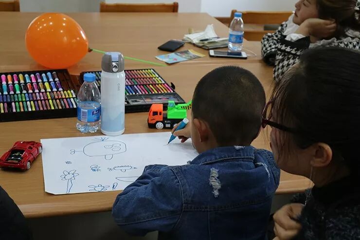 在“家庭水族馆”体验环节中,每位读者都以“海洋中的生物代表家庭成员”,用彩笔在纸上绘出以“我的家”为主题的手绘画。主讲人根据画中的海洋生物的大小与其代表的家庭成员,为读者进行家庭关系的心理学诠释。