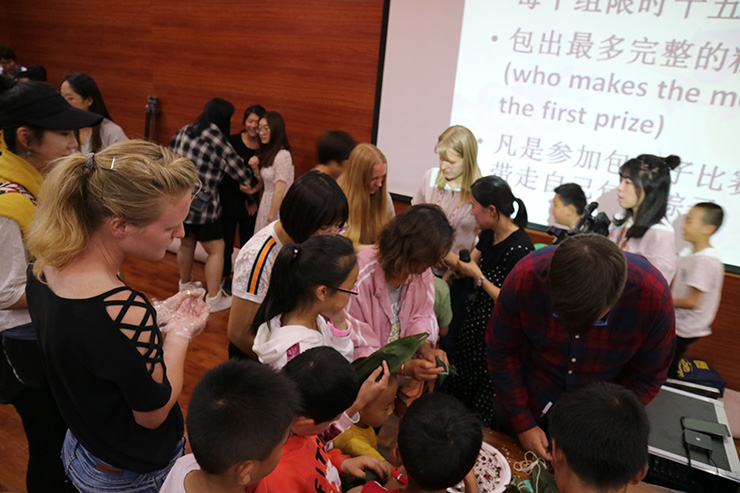 在制作粽子比赛的环节,留学生作为队长,分四队,带领小读者进行比赛。粽叶、糯米、红枣、线、独特的制作手法……这一切,都将读者们带入到了与“传统文化亲密接触“的意境中,让人不禁怀念屈原和向汨罗江投粽子的先祖们。